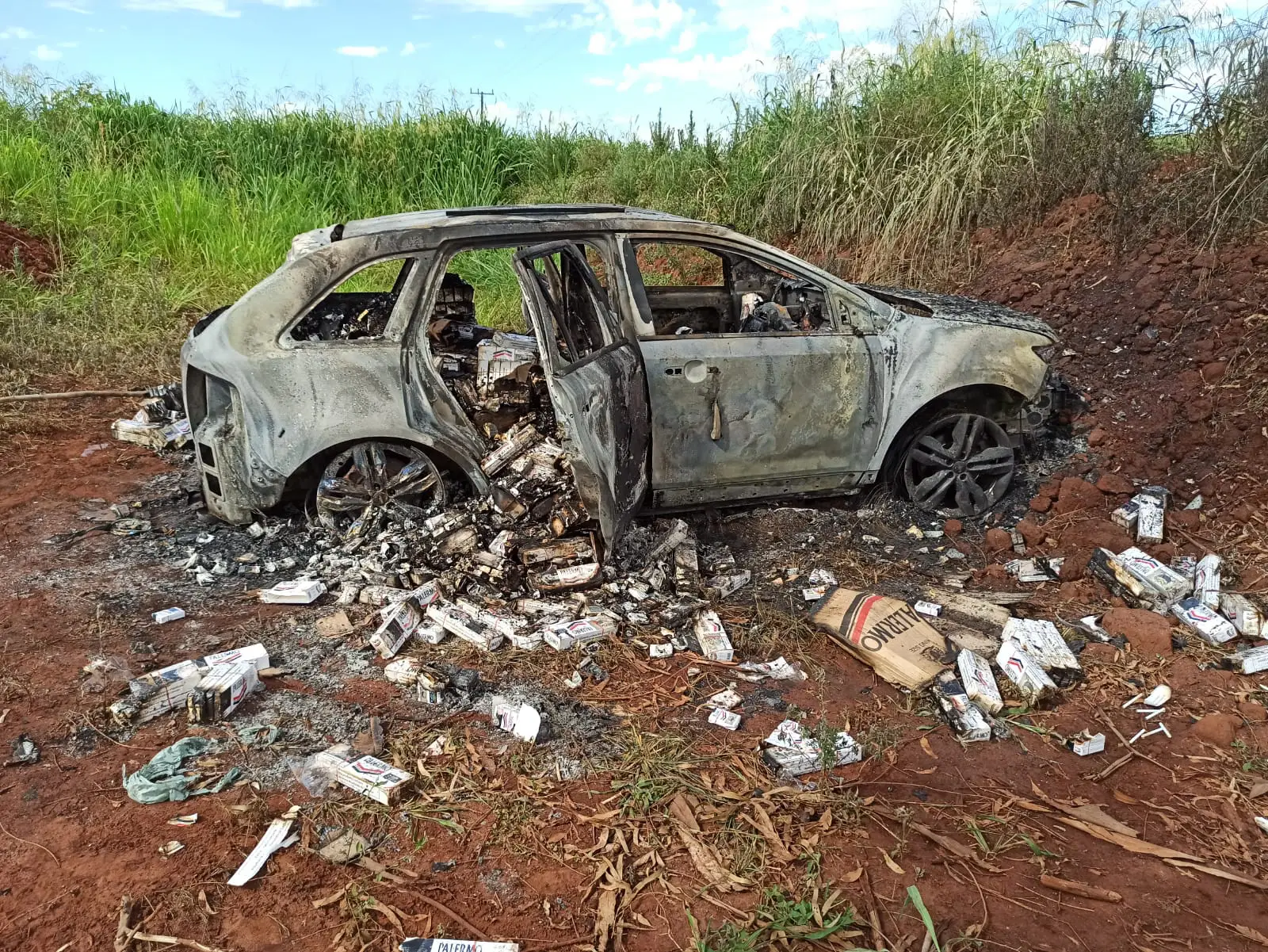 O carro e a mercadoria (cigarros de marca Palermo, de origem paraguaia) estavam totalmente queimados. Foi acionado o guincho do 8º Batalhão de Paranavaí, que auxiliou no recolhimento do veículo e encaminhou para a Receita Federal de Maringá.