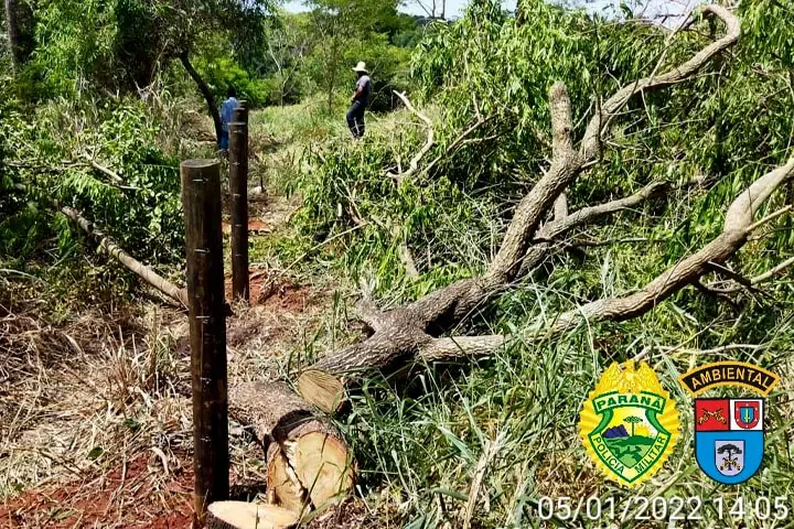 De acordo com a Polícia Militar Ambiental de Cianorte, a equipe estava cumprindo a escala de serviço referente a Operação Verão Paraná 2021/2022 no município de Marilena, nas proximidades do Porto Eucalipto, quando foram flagradas duas pessoas realizando o corte de essências nativas no interior da APP do Rio Paraná.