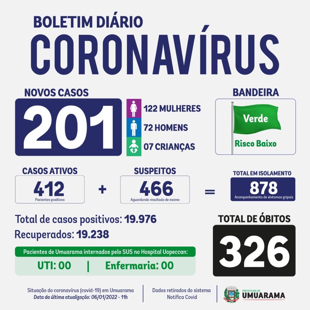 O número de pessoas contaminadas pelo coronavírus continua aumentando em Umuarama. De acordo com o Boletim Covid desta quinta-feira (6), 201 novos casos foram confirmados (são 122 mulheres, 72 homens e sete crianças). Embora preocupante, o aumento expressivo dos casos de Covid-19 não influenciou nas internações hospitalares: não há nenhuma pessoa da cidade em tratamento em enfermarias ou UTIs.