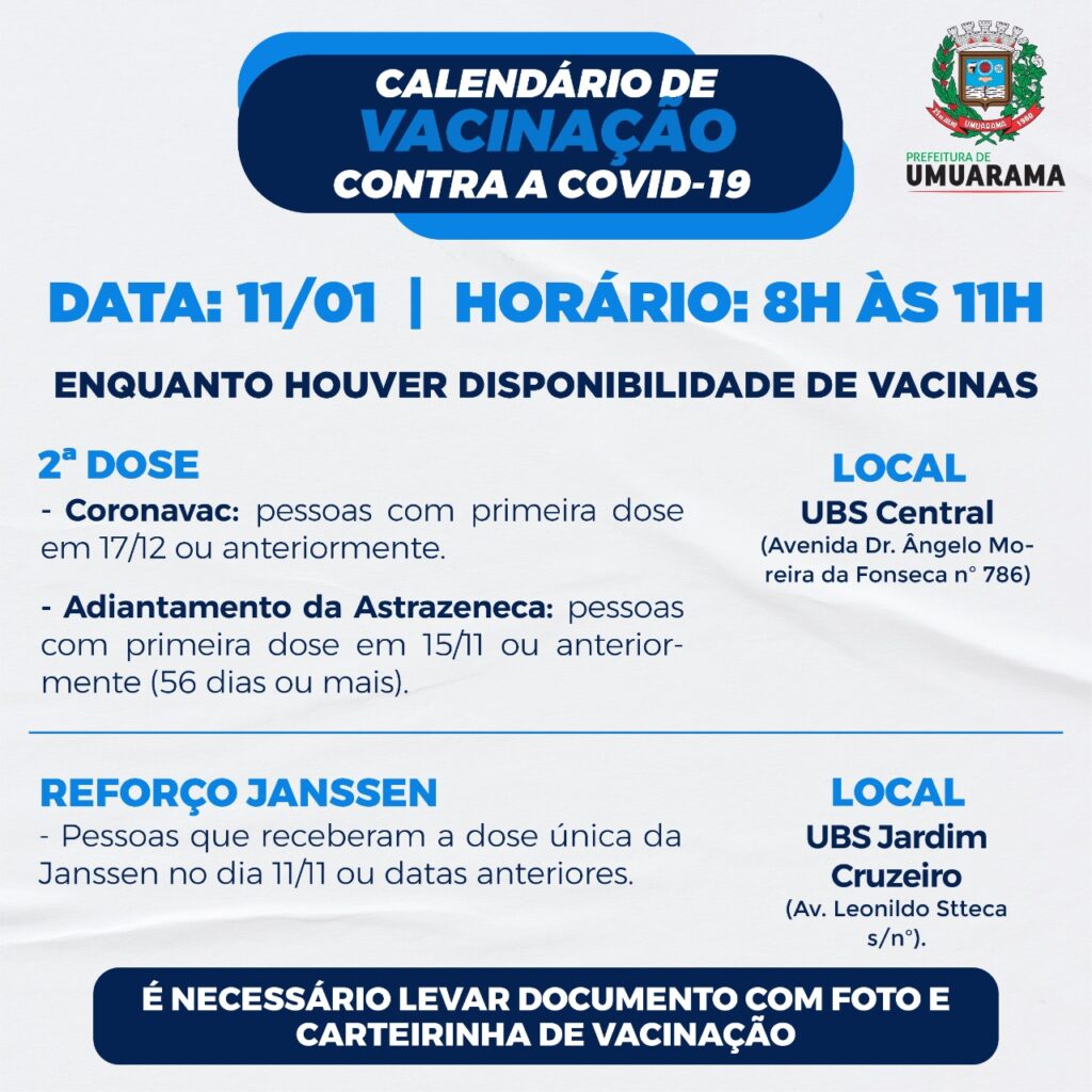 A Secretaria de Saúde de Umuarama segue com o cronograma de vacinação para quem ainda não completou o esquema vacinal com a 2ª dose (Astrazeneca e Coronavac) e reforço da Janssen contra o coronavírus.