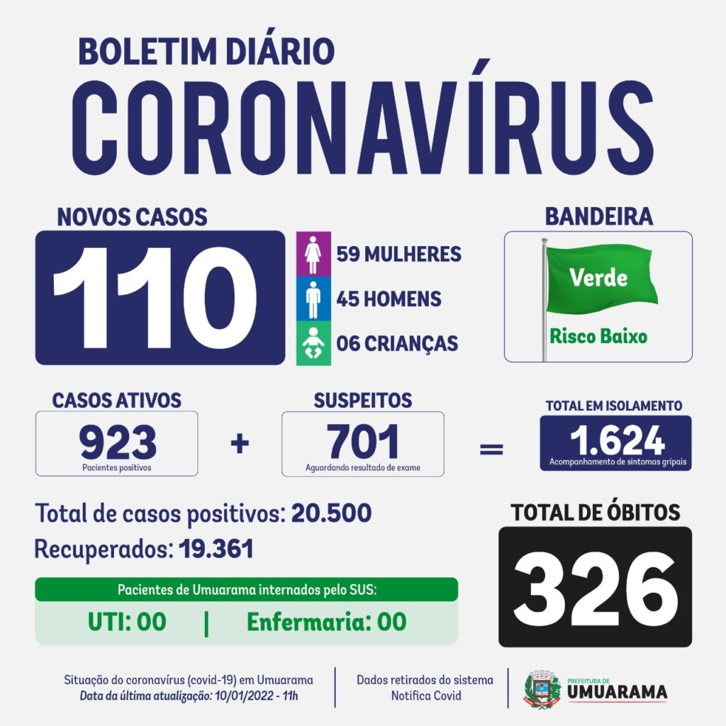 Não há nenhuma pessoa de Umuarama internada pelo SUS (Sistema Único de Saúde) para o tratamento da doença – nem em enfermarias, nem em UTIs – e, diante desses números, a Secretaria de Estado da Saúde (Sesa) continua classificando a cidade com bandeira verde, quando o risco de contaminação é considerado baixo.