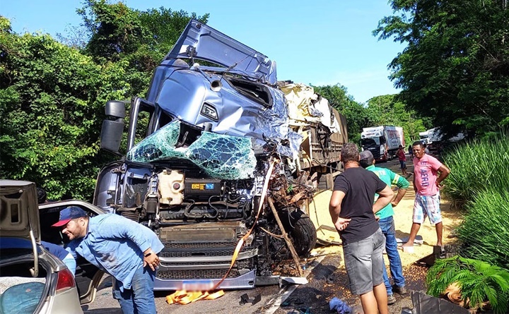 Motorista foi socorrida em estado grave após bater de frente com outra carreta