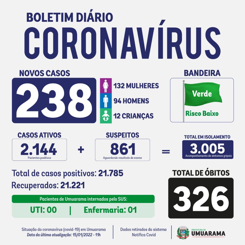 A Secretaria Municipal de Saúde de Umuarama destaca que os casos de covid-19 continuam em alta na cidade. De acordo com o Boletim Covid deste sábado (15), mais 238 pessoas foram diagnosticadas com o coronavírus (132 mulheres, 94 homens e 12 crianças).
