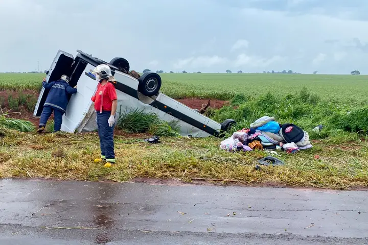 Três pessoas ficaram feridas em um acidente de trânsito registrado na tarde desta sexta-feira (28), na rodovia PR-486 nas proximidades de Brasilândia do Sul. De acordo com a Polícia Rodoviária Estadual (PRE), o motorista de uma Van com compristas perdeu o controle da direção e capotou às margens da via. Chovia bastante na hora do acidente.
