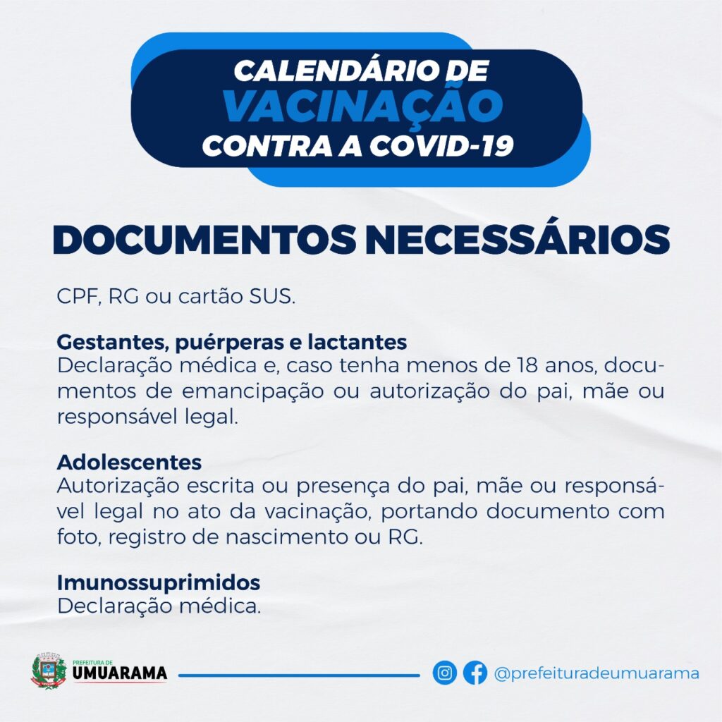 ➡Adolescentes: Autorização escrita ou presença do pai, mãe ou responsável no ato da vacinação, portando documento com foto, registro de nascimento ou RG.