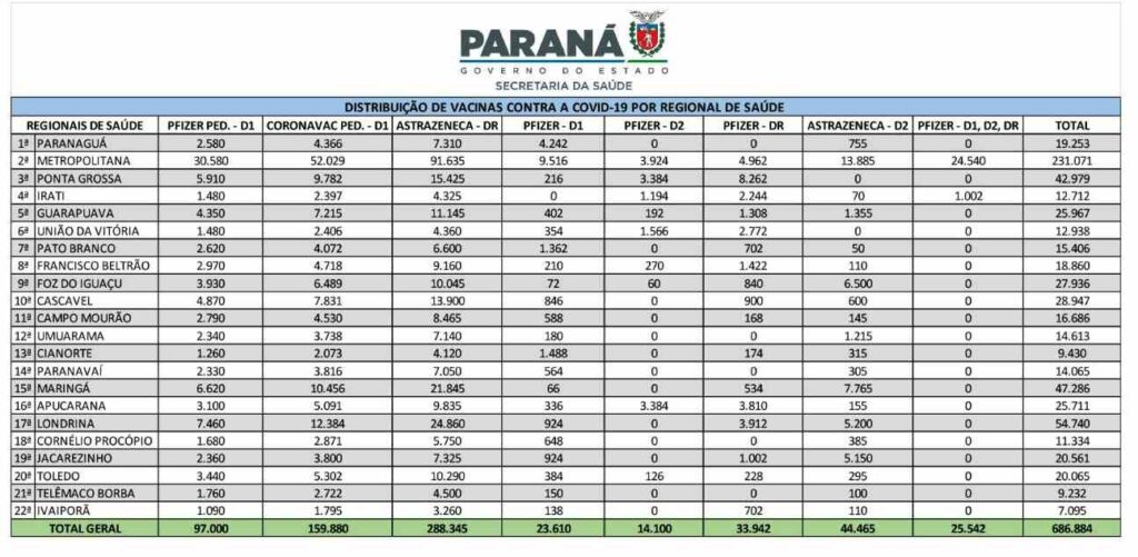 Com a nova distribuição, já são 542.220 imunizantes pediátricos descentralizados para os municípios, restando 59.140 doses de CoronaVac para D2 que permanecem armazenadas no Centro de Medicamentos do Paraná (Cemepar) para envio em tempo oportuno.