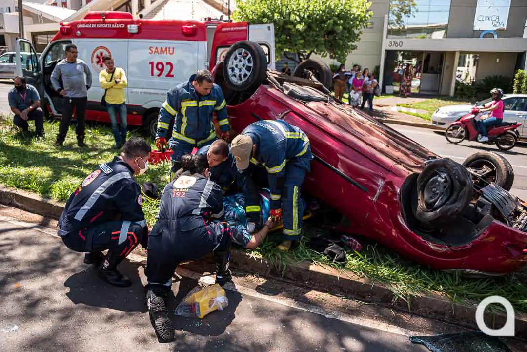 A outra condutora, de 58 anos, estava em um Citroën C3 preto. Ela teria saído do estacionamento e a colisão aconteceu. O Ford Ka acabou batendo no meio-fio, capotou e parou no canteiro central da avenida.