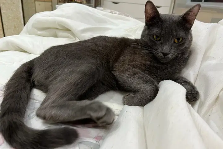 Morceguinho é um gatinho cinzento, que está utilizando uma coleira de cor vermelha. De acordo com Valeria, o animal é manso e não tem o costume de sair, portanto deve estar perdido.