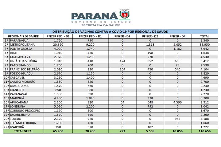 DISTRIBUIÇÃO – Das 110.656 vacinas da Pfizer, 65.900 são para início do esquema vacinal em crianças de 5 anos de idade, 28.400 para crianças de 6 a 11 anos, 792 vacinas para primeira dose e 5.508 para segunda dose de adolescentes e 10.056 para dose de reforço da população em geral por solicitação dos municípios. Todos os imunizantes são da Pfizer e serão enviados via terrestre às Regionais.