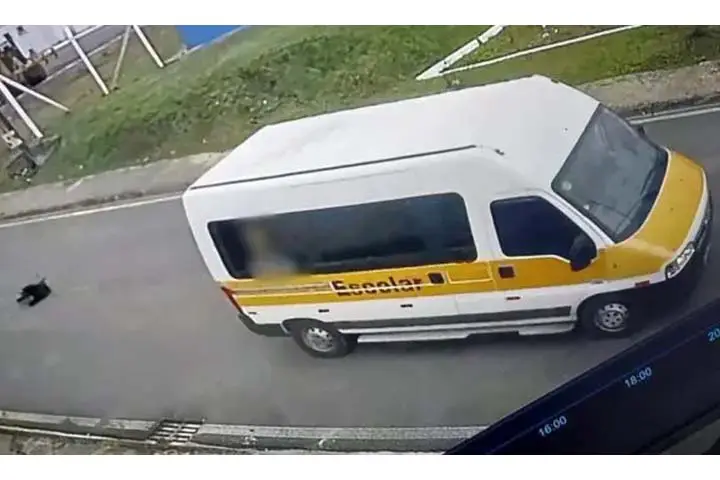 O vídeo também flagrou o momento em que uma das rodas da van escolar passa por cima do cachorro.