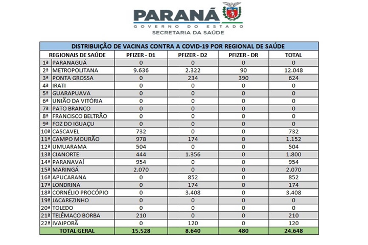 Confira a distribuição de doses enviadas nesta quinta-feira (3) por Regional de Saúde: