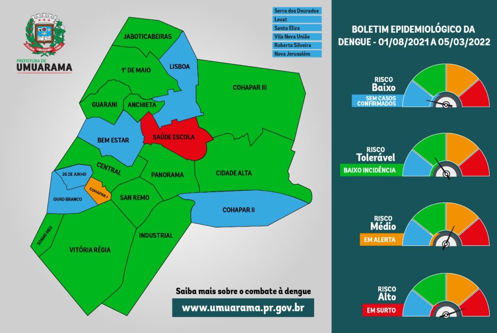 Informe técnico divulgado pelo Serviço de Vigilância em Saúde Ambiental da Secretaria Municipal de Saúde coloca a região central de Umuarama, atendida pela Unidade Básica de Saúde (UBS) Centro de Saúde Escola, em situação de surto de dengue após o aumento repentino no número de casos positivos, que saltou de 14 para 26 no acumulado desde agosto/2021.