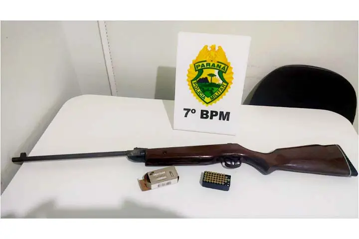No local, a mulher informou que havia sido agredida por seu cônjuge e ainda que ele tinha uma arma de fogo na casa. Autorizada as buscas, foi encontrada uma espingarda calibre 22 e 43 munições do mesmo calibre. O homem recebeu voz de prisão em foi encaminhado ao órgão competente, que também recebeu a arma de fogo e munições apreendidas.