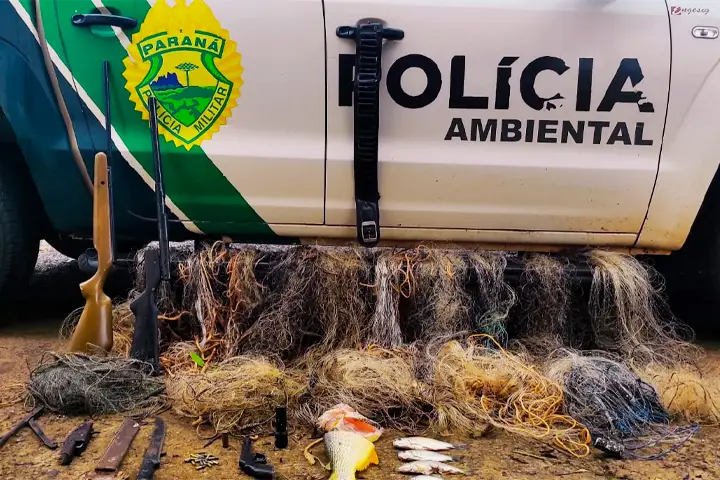A Polícia Ambiental prendeu três homens em flagrante neste fim de semana, em Ivaté. Com eles a polícia encontrou 16 redes de pesca, mais de um quilo de peixe nativo, uma espingarda, dois simulacros de espingarda e 18 munições.