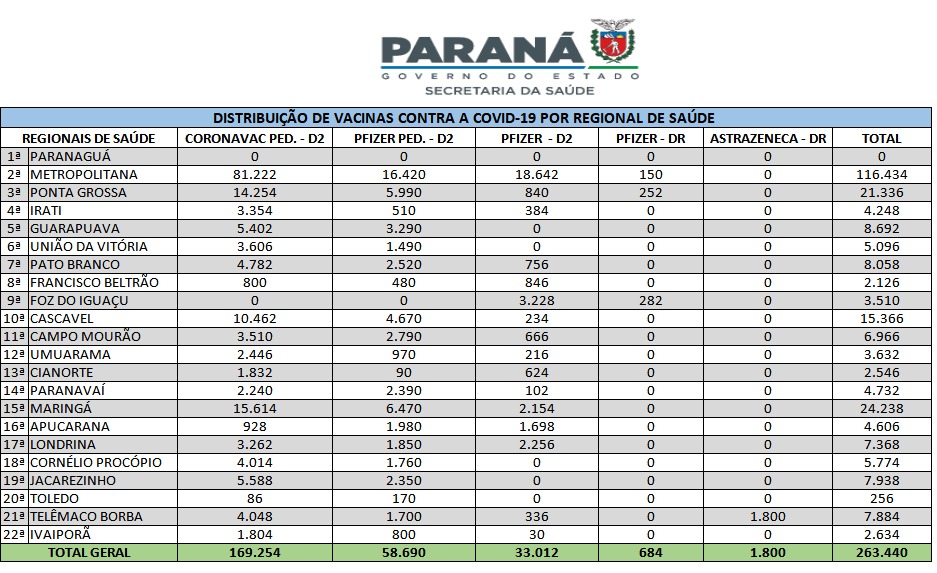 NOVAS DOSES – O Ministério da Saúde confirmou o envio de mais 97.000 vacinas pediátricas da Pfizer. Os imunizantes devem chegar nesta quinta-feira (24), no Aeroporto Internacional Afonso Pena, em São José dos Pinhais, na Região Metropolitana de Curitiba, às 9h15, no voo LA-4777.
