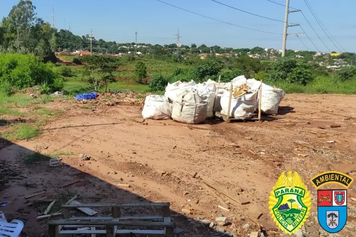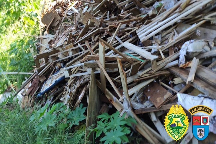 Os policiais do batalhão da Polícia Ambiental Força Verde em atendimento a denúncia de descarte de resíduos sólidos em local inapropriado e sem licença. Nos fundos do terreno da empresa foram encontrados pedaços de madeira, tecido e plástico.