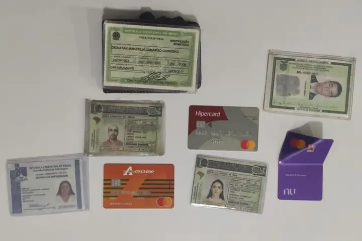 - Uma carteira Lacoste de cor marrom com documentos em nome de Dionatam Makerlin Camargo;