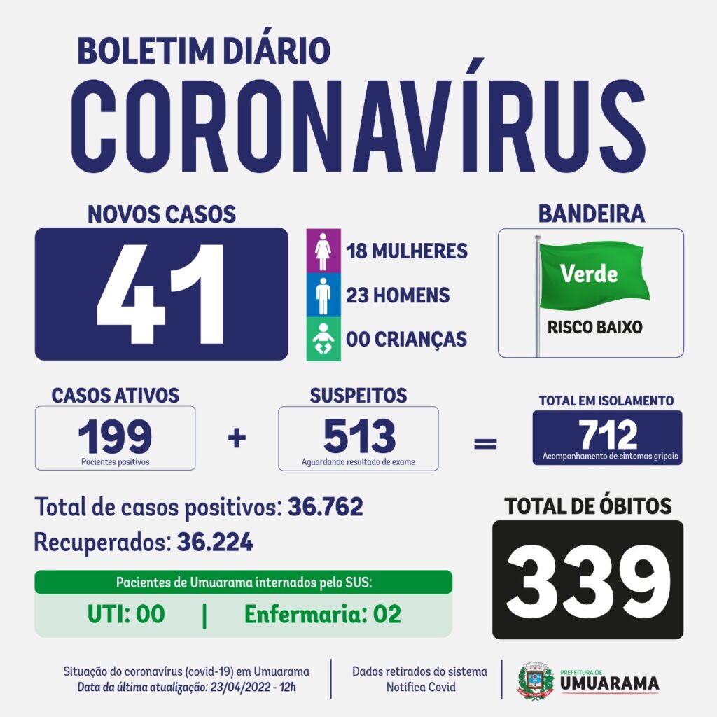 O Boletim Covid deste sábado (23) informa que 41 novos casos foram confirmados, sendo 18 mulheres, 23 homens e nenhuma criança. Desde o início da pandemia, em março de 2020, 36.762 pessoas foram diagnosticadas com a doença – deste total 36.224 se recuperaram.