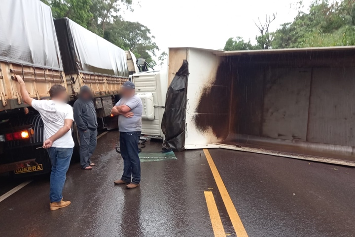 Caminhão tomba na rodovia entre Umuarama e Xambrê e trecho fica interditado nesta manhã
