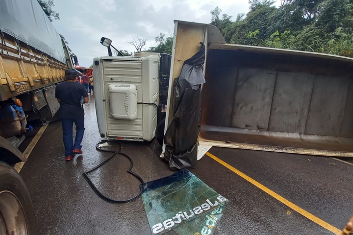 O caminhão ficou completamente destruído e o tráfego na rodovia está bloqueado. A Polícia Rodoviária Estadual (PRE) foi acionada para apurar as causas do acidente.