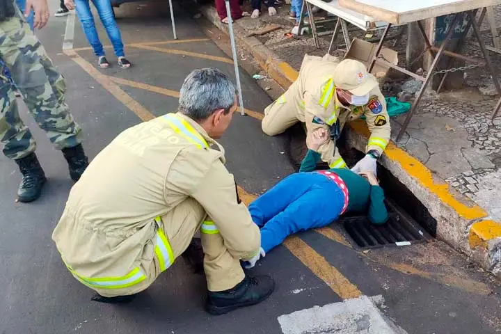 Equipes do Corpo de Bombeiros foram acionadas para retirar a mulher que estava com o corpo preso no bueiro. A mulher na sequência foi transportada por uma equipe do Samu ao hospital Nossa Senhora Aparecida. Ela apresentava uma lesão na cabeça.