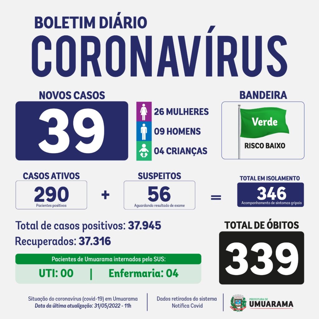 Maio chega ao fim com o anúncio de 39 novos casos de covid em Umuarama – foram 26 mulheres, nove homens e quatro crianças – uma de 2 anos, duas de 3 anos e uma de 6 anos (nenhuma delas tomou vacina). O mês teve média de 30 casos diários e se encerra com 934 casos totais, sendo que 536 são mulheres (57,4%), 361 são homens (38,6%) e 37 são crianças (4%).