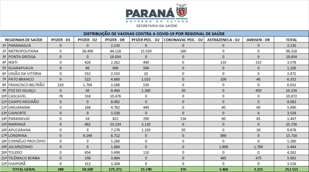 A Secretaria de Estado da Saúde (Sesa) atendeu o pedido de pelo menos 330 municípios paranaenses e distribuiu mais 252.551 vacinas contra a Covid-19 nesta quarta-feira (1º). A nova remessa inclui o primeiro lote com dose de reforço (DR) para adolescentes de 12 a 17 anos, com 171,3 mil imunizantes. As vacinas foram retiradas no Centro de Medicamentos do Paraná (Cemepar) pelas 22 Regionais de Saúde durante a manhã.