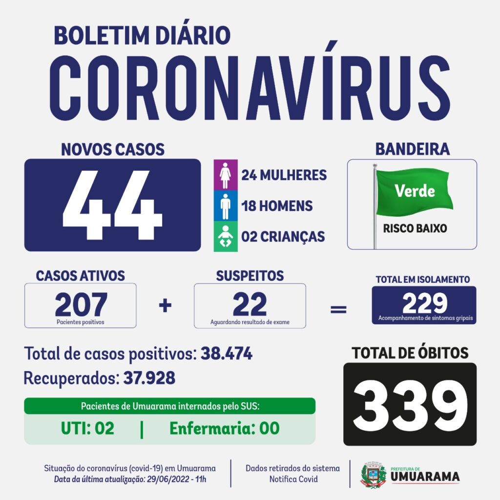 Emitido diariamente pela Secretaria Municipal de Saúde de Umuarama, o Boletim Covid desta quarta-feira (29) informa que 44 novos casos foram confirmados, sendo 24 mulheres, 18 homens e duas crianças – uma de quatro anos, que ainda não tomou vacina, e outra de oito anos, que já tomou uma dose do imunizante.