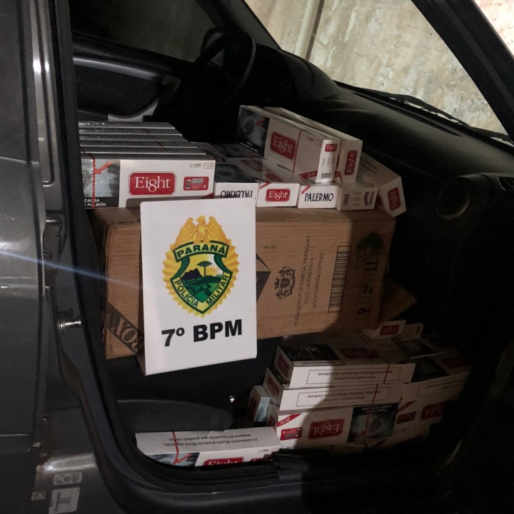 Durante um patrulhamento realizado na noite desta sexta-feira (8) um condutor de automóvel Renault/Logan, de 24 anos, foi preso por contrabandear aproximadamente 26 caixas de cigarros oriundos do Paraguai.