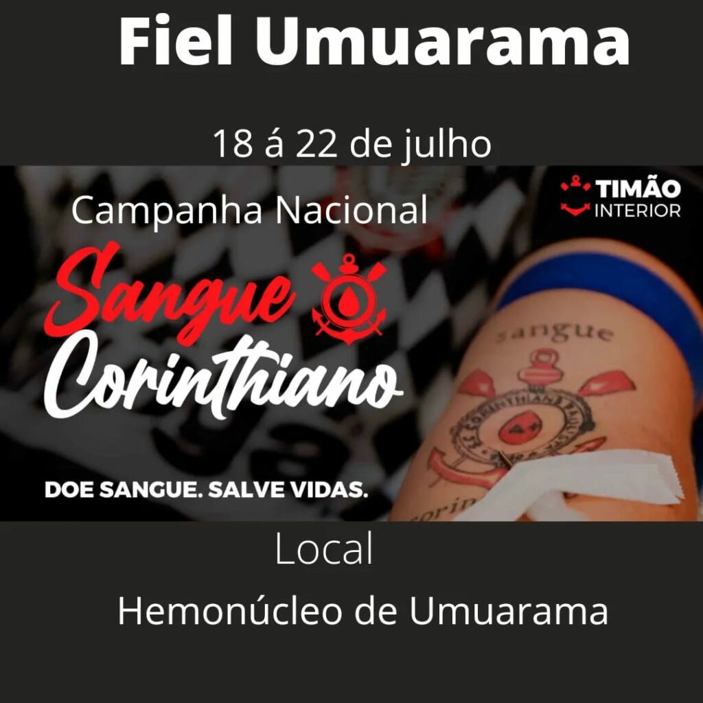 Corinthianos de toda região estão sendo convidados para uma ação mais que especial: doar sangue para o Hemonúcleo de Umuarama. O chamamento faz parte da campanha nacional “Sangue Corinthiano” e está sendo feito pela diretoria do grupo Fiel Capital da Amizade e é estendido a toda a população. Será durante toda a próxima semana – de 18 a 22 de julho.