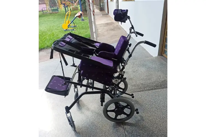 Eliana acrescentou que estas cadeiras são feitas de acordo com as necessidades de cada aluno, como suporte para tronco, ou outros itens. A diretora ainda comentou que a cadeira é adquirida com ajuda da comunidade e fica com o aluno, ou seja, ele usa o equipamento na escola, mas vai para casa com ele.