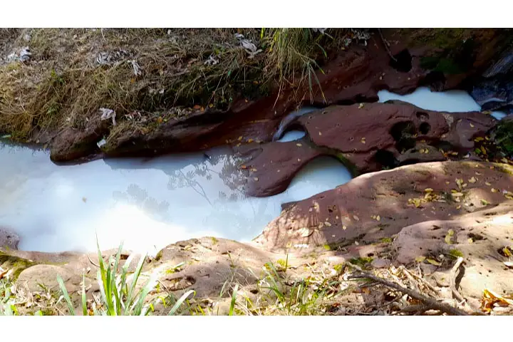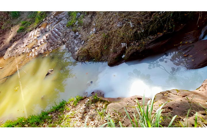 Morador denuncia água esbranquiçada saindo de galeria que deságua no Lago Aratimbó