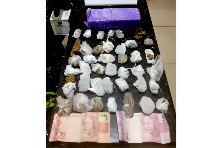 Ao avistar a viatura policial, um dos indivíduos dispensou um material que estava em sua cintura. Em revista pessoal nada foi encontrado com eles, porém em busca pelo conteúdo dispensado pelos arredores os policiais conseguiram encontrar um pacote plástico contendo 42 porções de maconha e um tablete inteiro da droga.