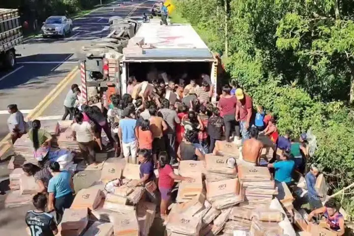 Caminhão tomba e multidão saqueia carga de frango congelado na BR-277