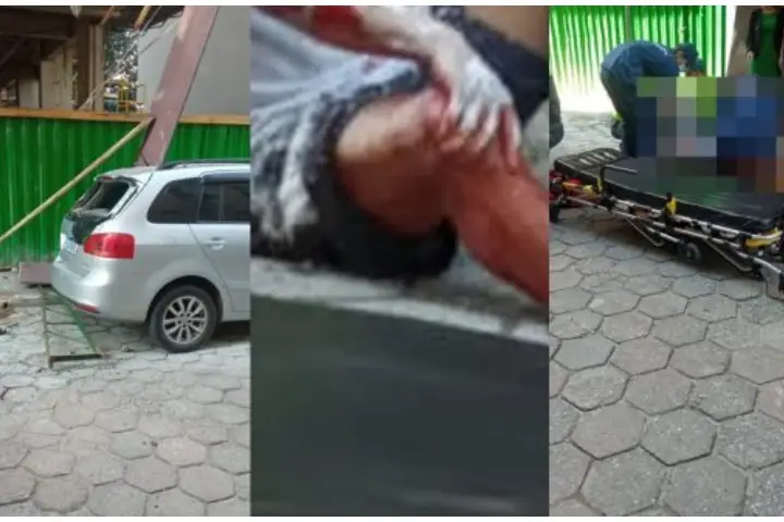 Na queda, o homem atravessou duas bandejas de proteção da obra, quebrando o compensado naval e, na parte do térreo, caiu sobre o vidro traseiro de um automóvel estacionado na via pública. O homem foi socorrido consciente e orientado