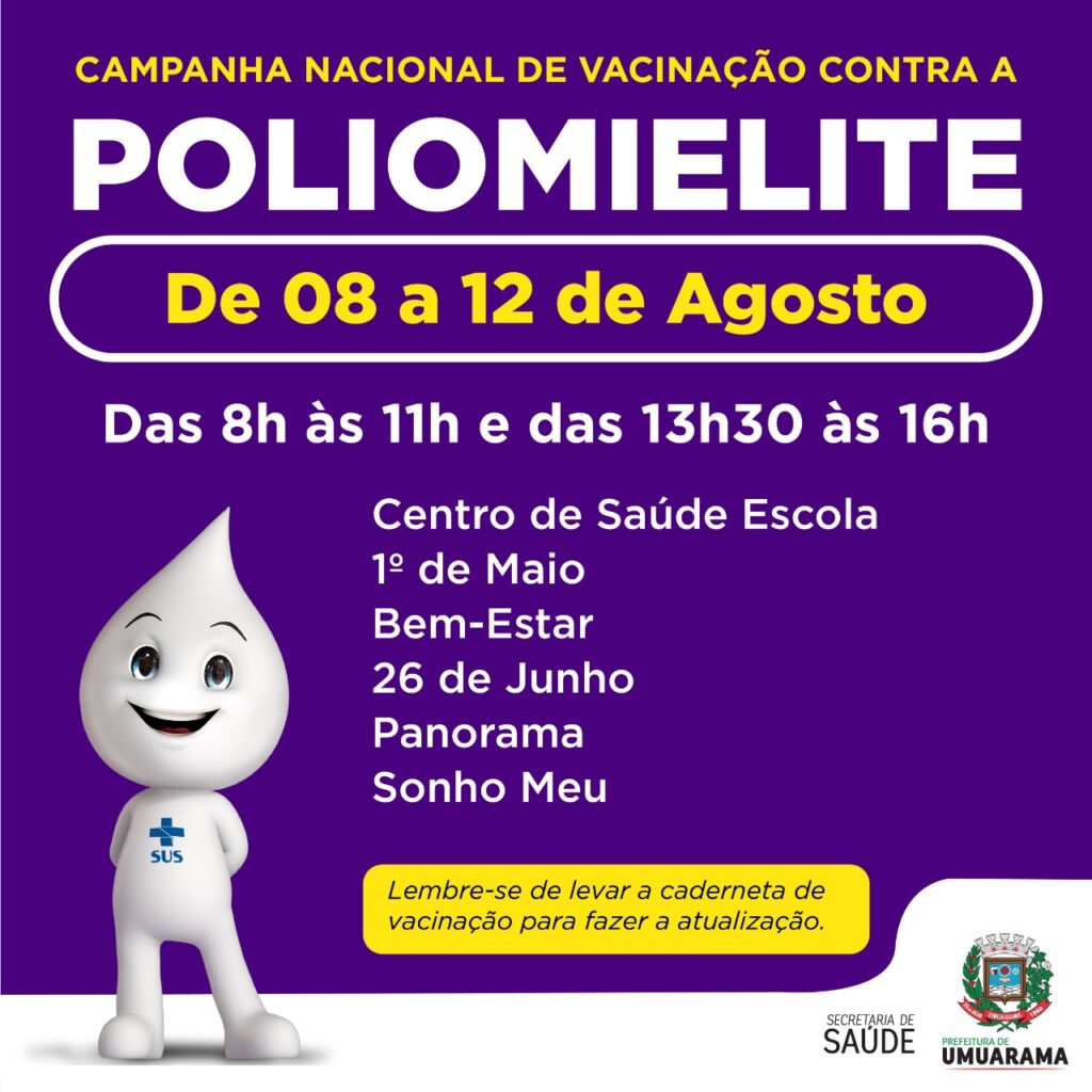A Secretaria de Saúde de Umuarama divulgou que o município está participando da Campanha Nacional de Vacinação contra a Poliomielite. Devem ser imunizadas as crianças de 2 meses até 5 anos de idade.