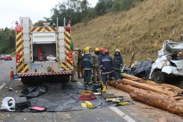 12/09/2022 às 15:12 Quatro pessoas morrem após caminhão que transportava madeira derrubar carga na BR-376