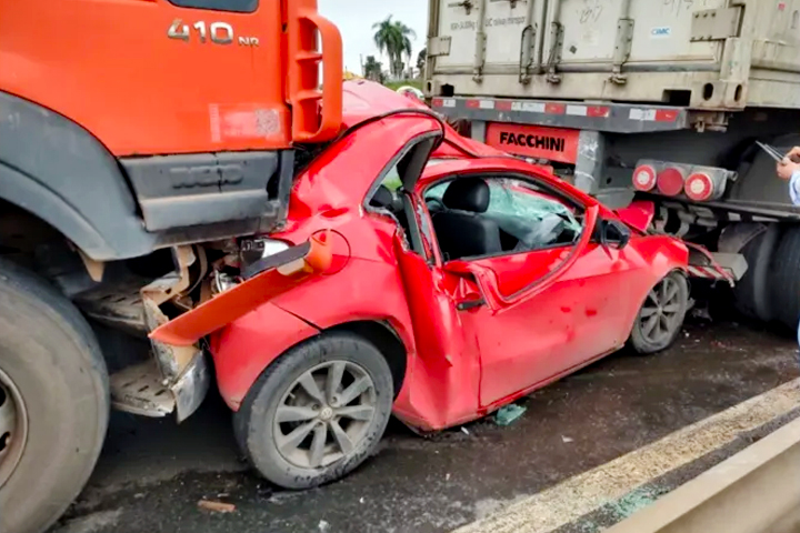 21/10/2022 às 14:51 Milagre: Família sai ilesa de acidente onde carro foi quase esmagado entre caminhões