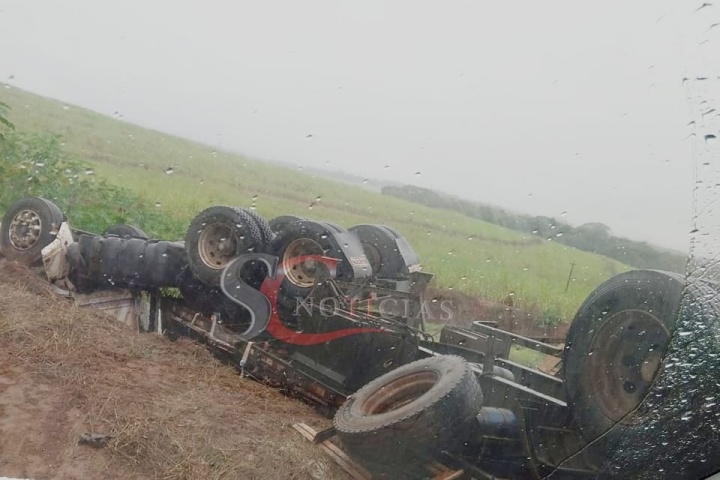 14/06/2023 às 10:19 Caminhão capota em trevo da PR-082 e carga de fécula de milho fica espalhada pela pista