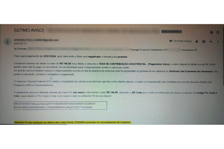 23/01/2024 às 18:44 Sindilojistas faz alerta sobre golpe envolvendo um fictício Sindicato de Empresas de Umuarama