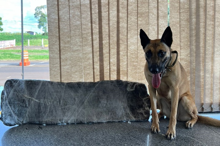 28/02/2024 às 10:16 Cão da PM ajuda a prender mulher que saiu de Umuarama com 12 kg de haxixe presos ao corpo