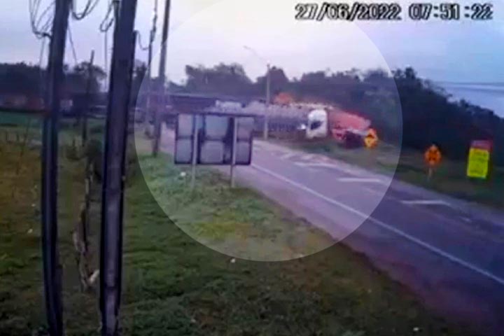 28/06/2022 às 10:37 Câmeras de segurança flagram trem colidindo e arrastando carreta em Morretes; assista