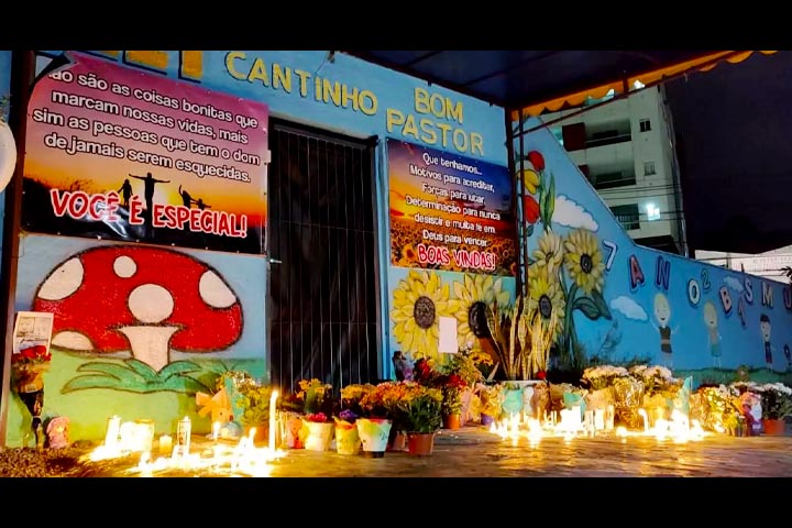 06/04/2023 às 09:37 Familiares e amigos prestam homenagens para crianças vítimas de ataque em creche de SC