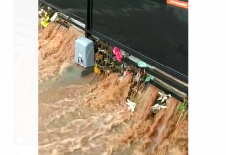 21/09/2022 às 17:06 Enxurrada arrasta lama, flores e vasos do cemitério para o portão do Parque Cidade Jardim