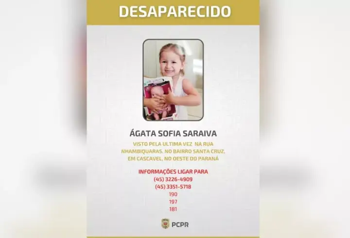 20/01/2024 às 09:12 Polícia Civil divulga cartaz para ajudar nas buscas por Ágata Sofia Saraiva, menina que foi raptada